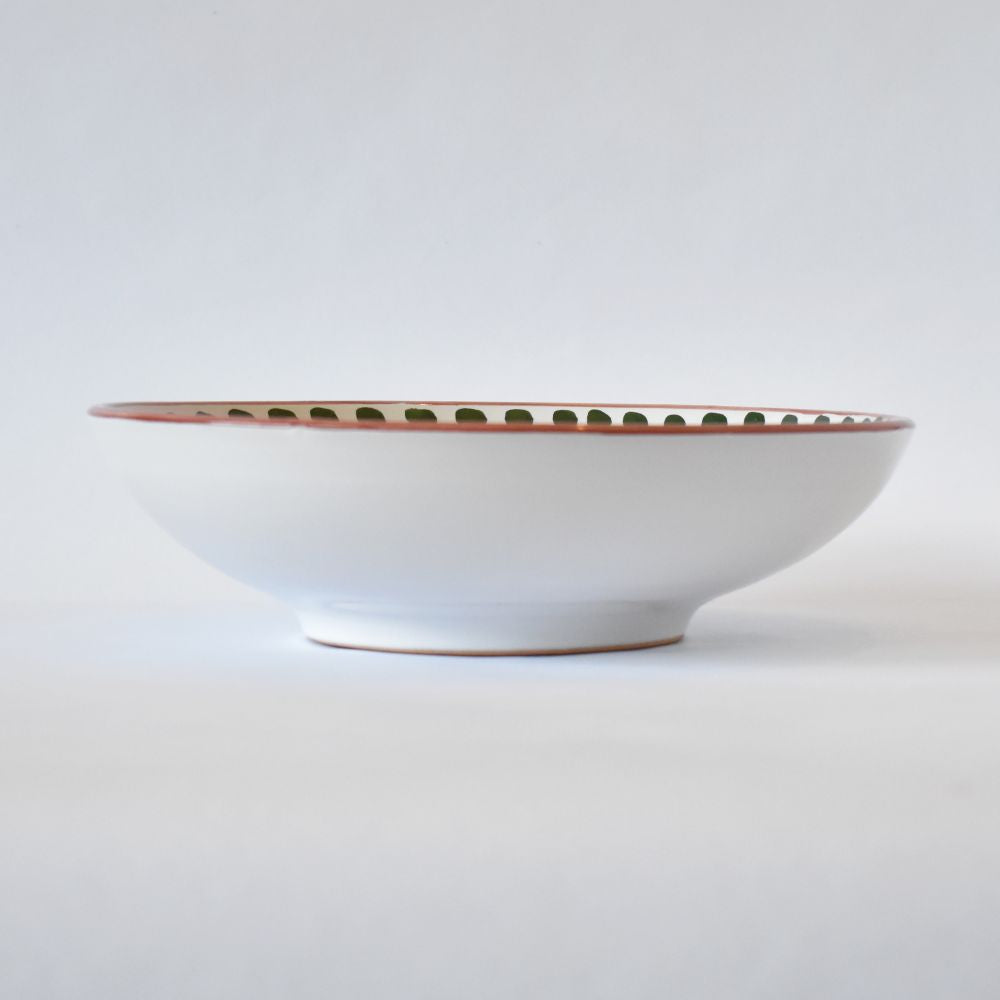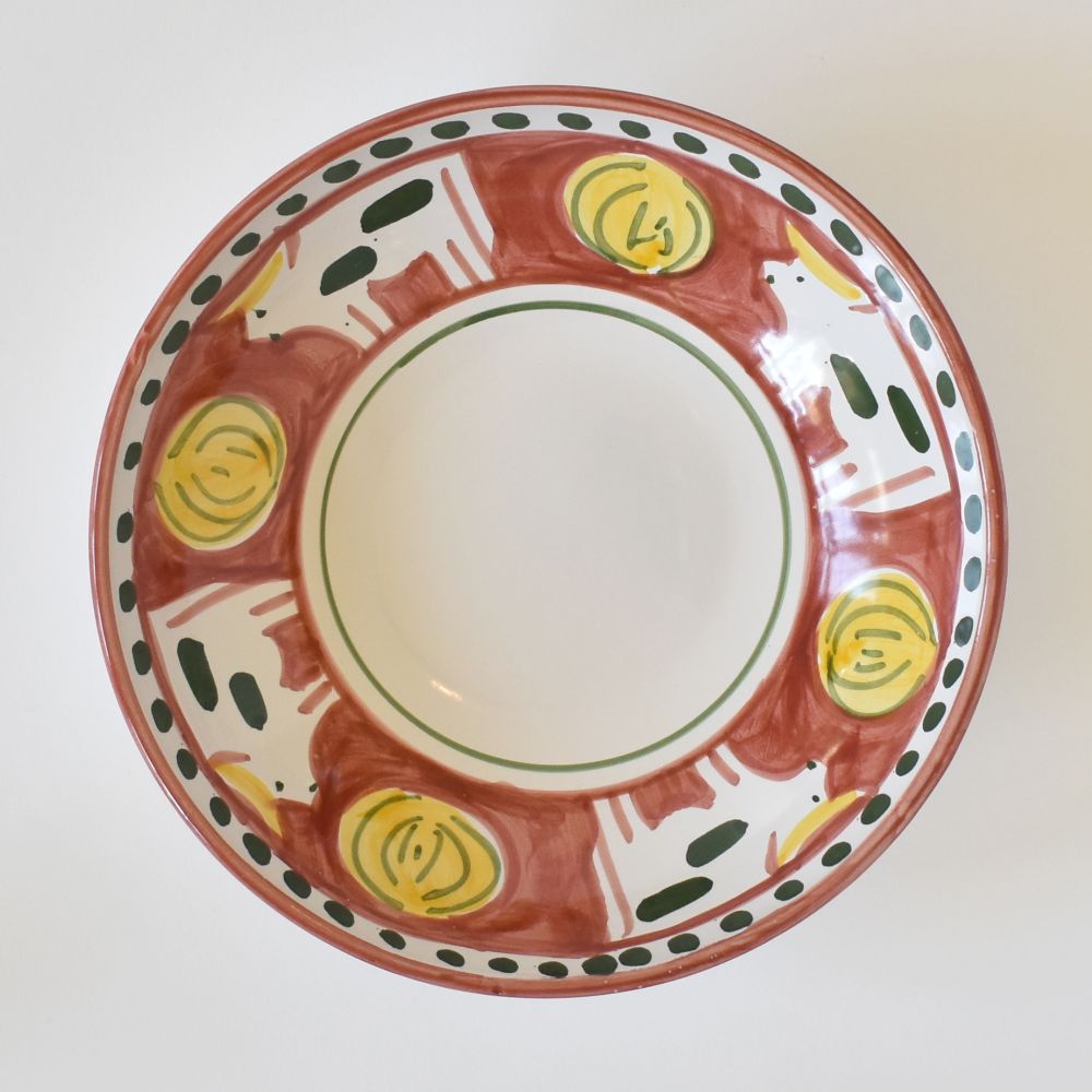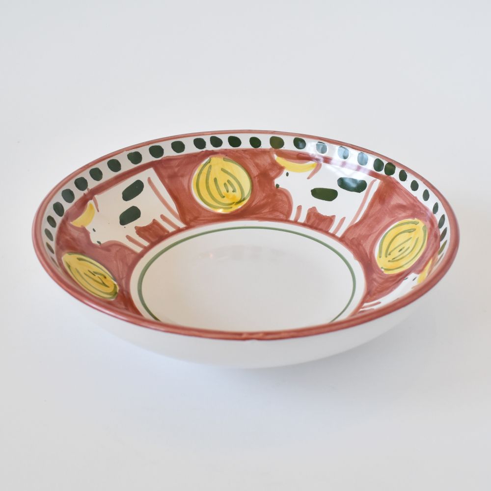 La Mucca (Mucca) color rosso mattone della collezione Campagna pascola intorno alla nostra ciotola preferita in assoluto per generose porzioni di pasta. La forma a coppa di questa ciotola in ceramica è perfetta anche per insalate singole condite con proteine, o come piatto da portata per servire salse o portare in tavola contorni di cereali o verdure. Dipinta a mano dallo studio Solimene di Vietri sul Mare, sulla Costiera Amalfitana.