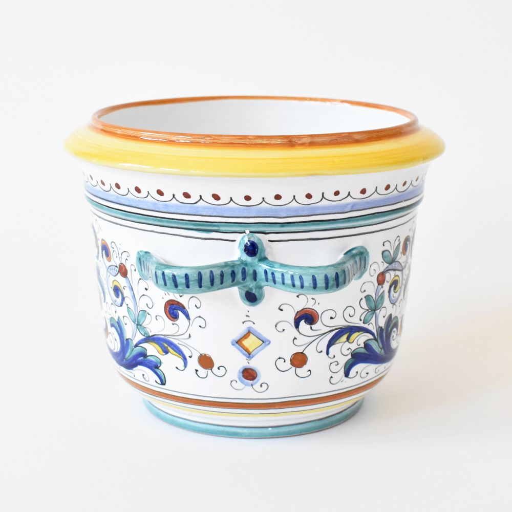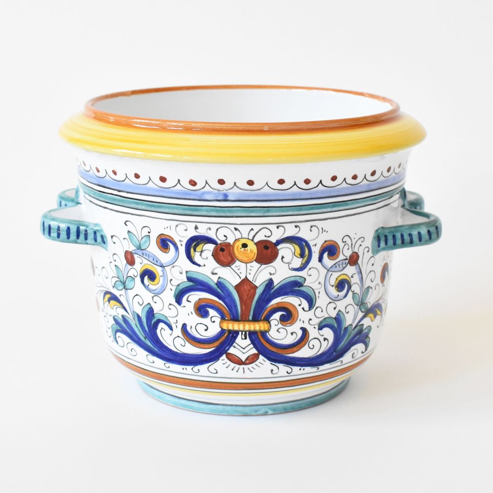Ogni pianta d'appartamento rigogliosa ha bisogno di un bel vaso in cui vivere, e questa fioriera da tavolo nel classico design italiano Ricco Deruta è il tocco finale che le tue piante verdi, le tue erbe aromatiche o i tuoi fiori meritano. Realizzato a mano da artigiani di Deruta, in Italia, la classica forma affusolata e l'ingombro ridotto di questo portavaso in ceramica maiolica contengono perfettamente una pianta in vaso standard da 6 piedi e si adattano elegantemente a un tavolo, un piano di lavoro, una panca o un davanzale profondo.