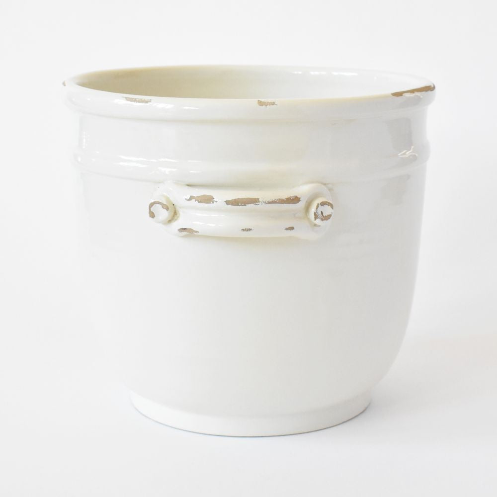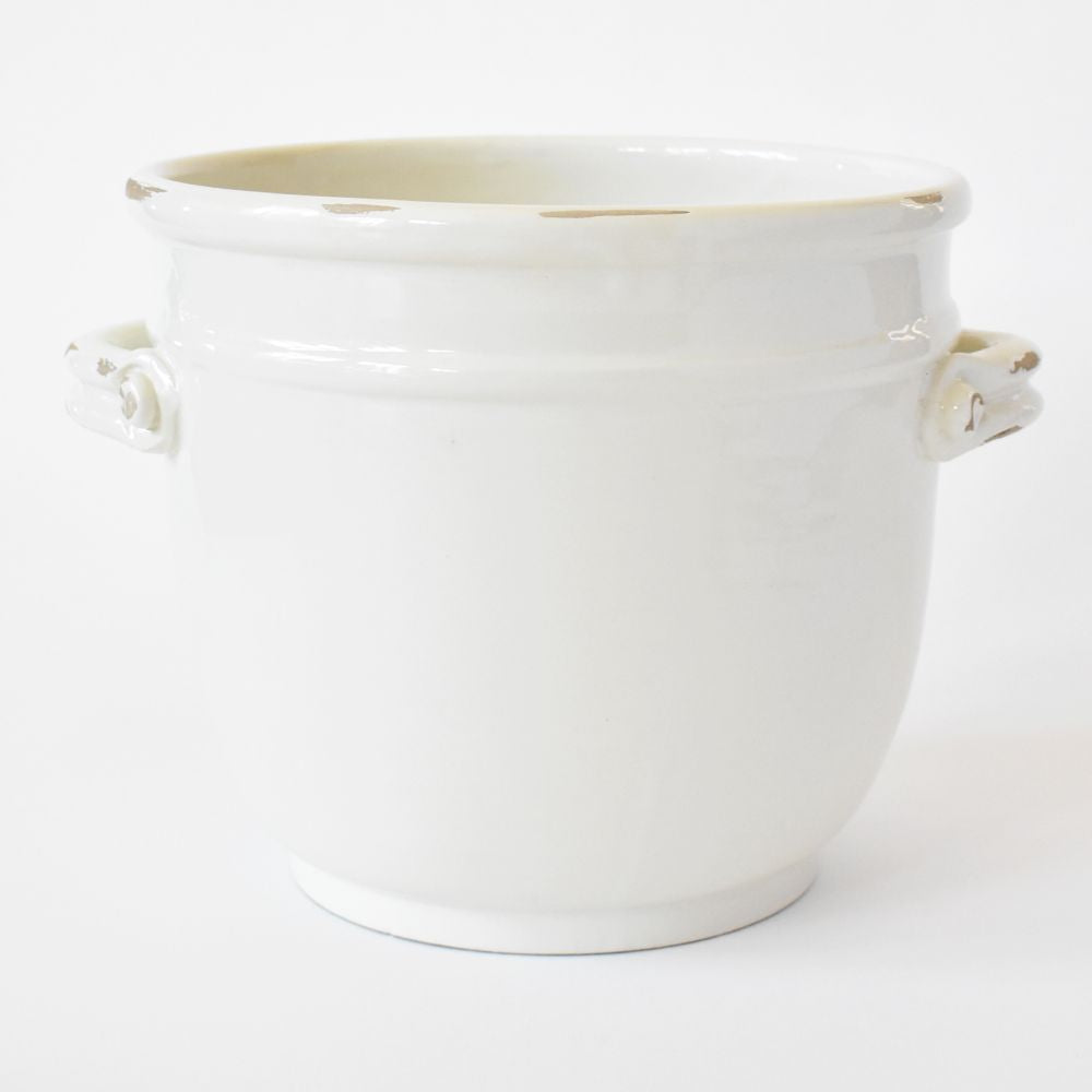 Vaso di medie dimensioni in ceramica italiana fatto a mano, smaltato in bianco sporco massiccio con leggera anticatura (effetto consumato) sul bordo e manici ornamentali