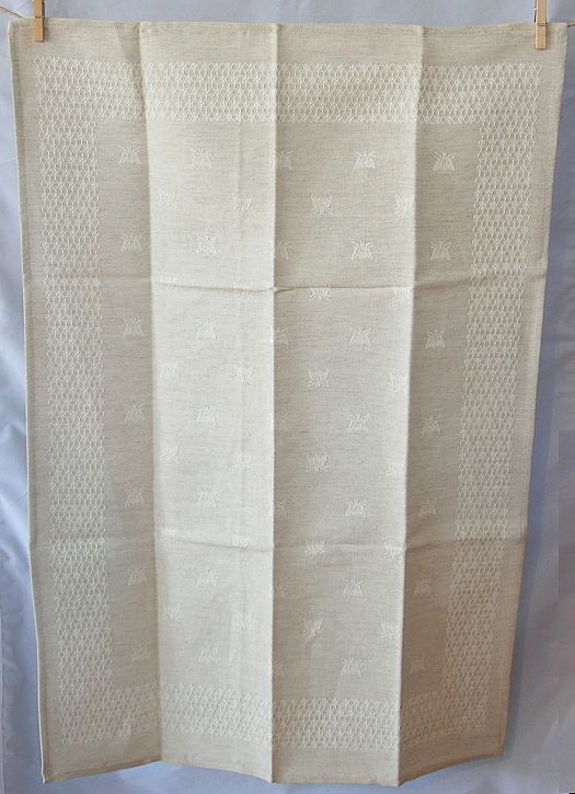 Strofinaccio da cucina in tessuto jacquard color lino naturale con motivo ape, 50% lino/50% cotone. Realizzato dalla Tessitura Pardi, laboratorio di lino vicino a Montefalco, il centro della produzione di lino dell'Umbria.