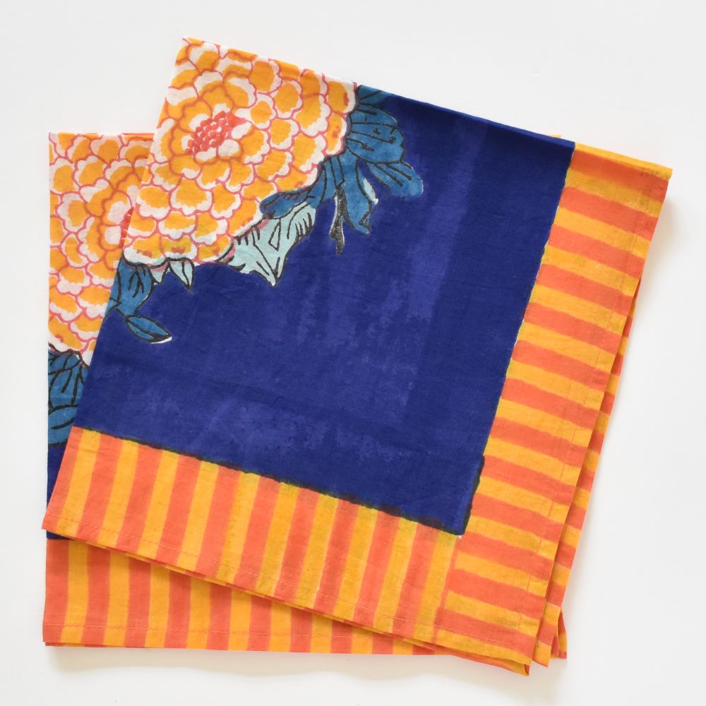 L'abbondante motivo floreale Corolla, nei toni caldi del giallo, dell'arancione e del blu oceano, sboccia su uno sfondo blu cobalto intenso su questi tovaglioli di cotone stampato, morbidissimi e irresistibili, di Lisa Corti a Milano. Venduti in coppia per adattarsi perfettamente alle vostre esigenze, potete completare una tavola eclettica... o presentarli da soli su un tavolo con una splendida venatura... o reinventare il vostro bancone per la colazione come un bar all'italiana !