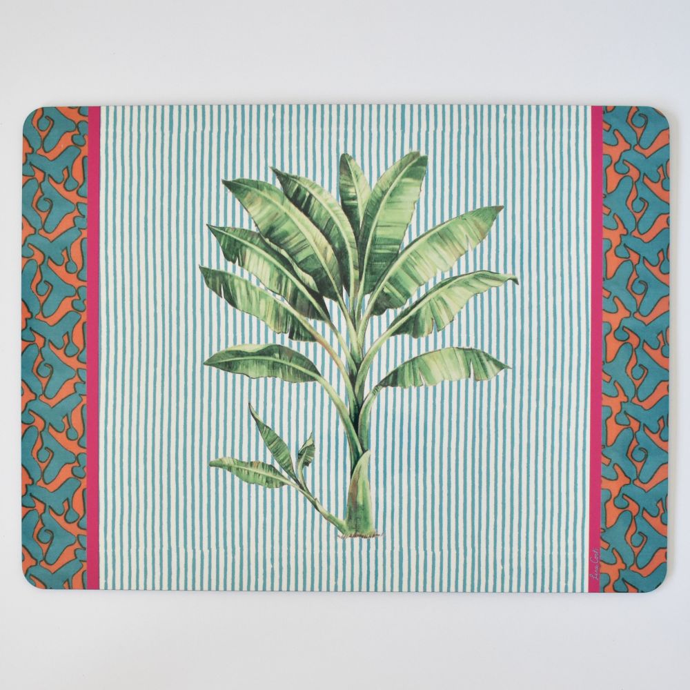 I sottopiatti con motivo Banano sono perfetti da abbinare a un mix di tovaglioli, tra cui le stampe Leaves Green e Flame.