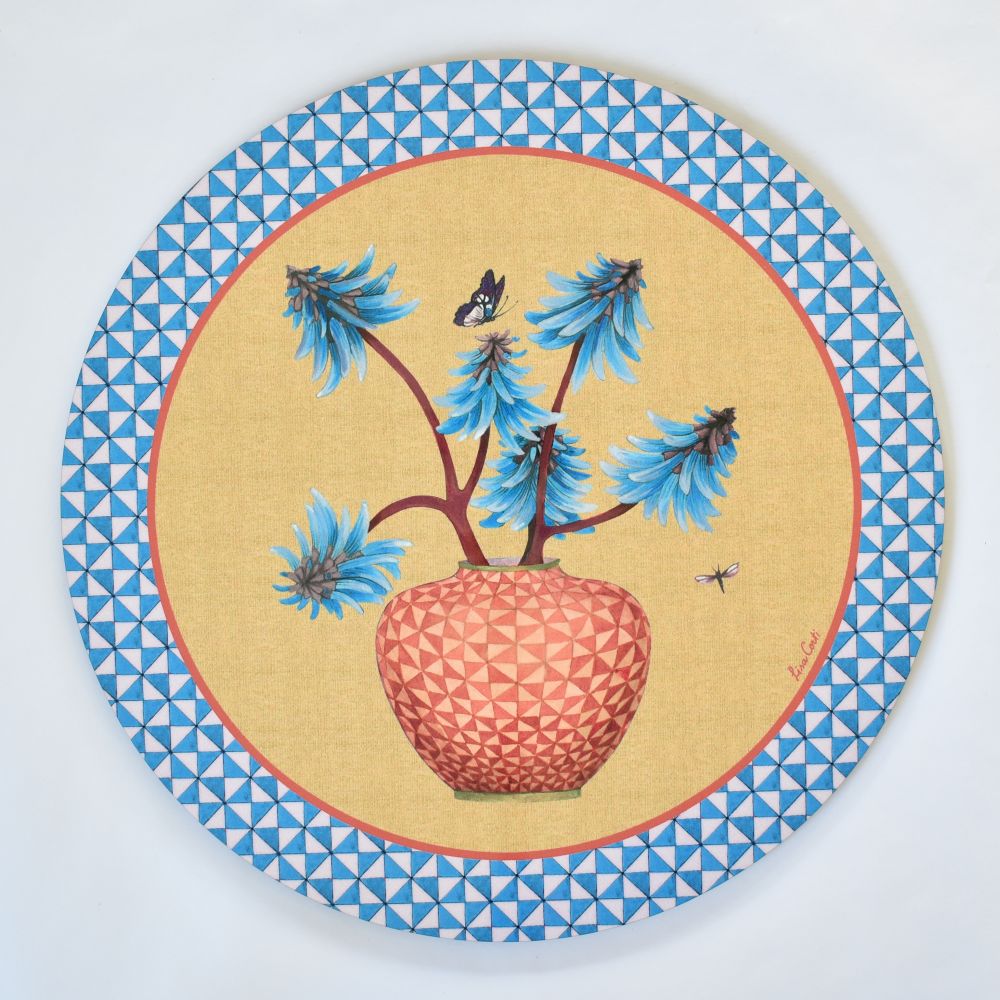 Pottery Gold presenta fiori (turchese e marrone) in un vaso (arancione ruggine e pesca bianca) su uno sfondo color miele e camoscio. Utilizzate questi sottopiatti rotondi in masonite in set misti o abbinati come tovagliette o sottopiatti, oppure singolarmente al centro di un tavolo, sul piano di lavoro della cucina o sul mobile del bagno. La finitura lucida dà vita a questi disegni colorati, mentre il retro in sughero protegge le superfici.