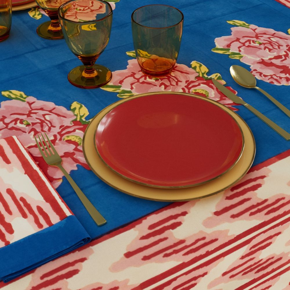 L'abbinamento di una stampa a fiamme rosse e rosa pesca con un piano del tavolo in un blu brillante e uniforme mette sapientemente in risalto le rose in stile inglese del design Nina's Rose Blue di Lisa Corti, con stampa a blocchi, perfettamente proporzionato per impreziosire il tuo tavolo rotondo o quadrato in ambienti esterni o interni. Il tessuto 100% cotone, di peso medio-leggero, è opaco e ha un drappeggio leggermente più pesante.