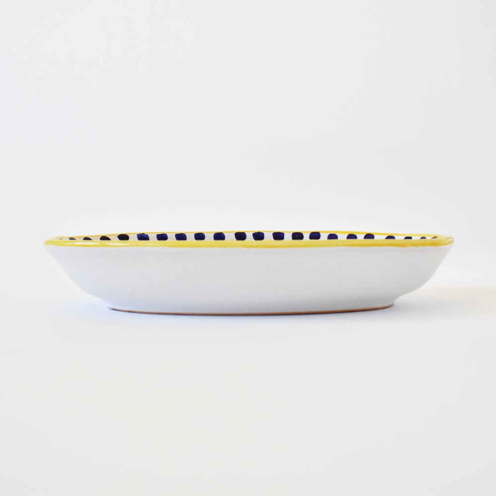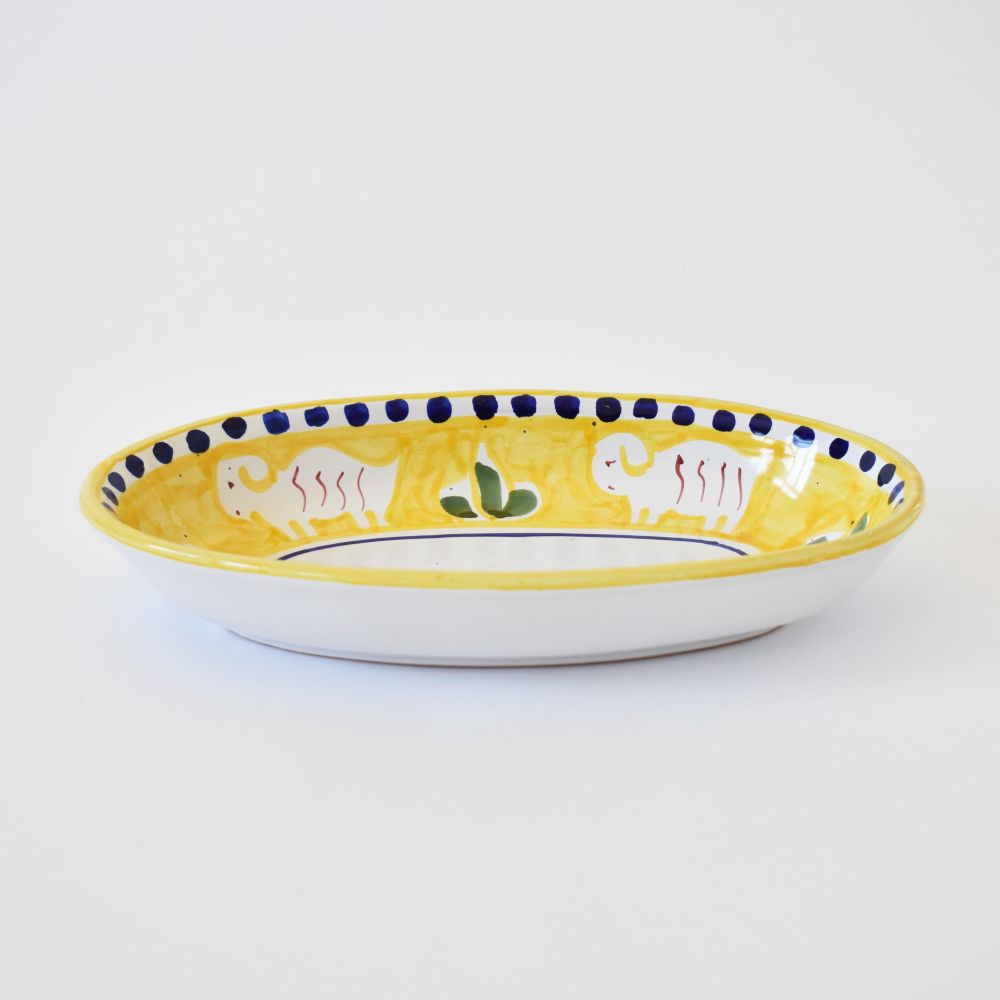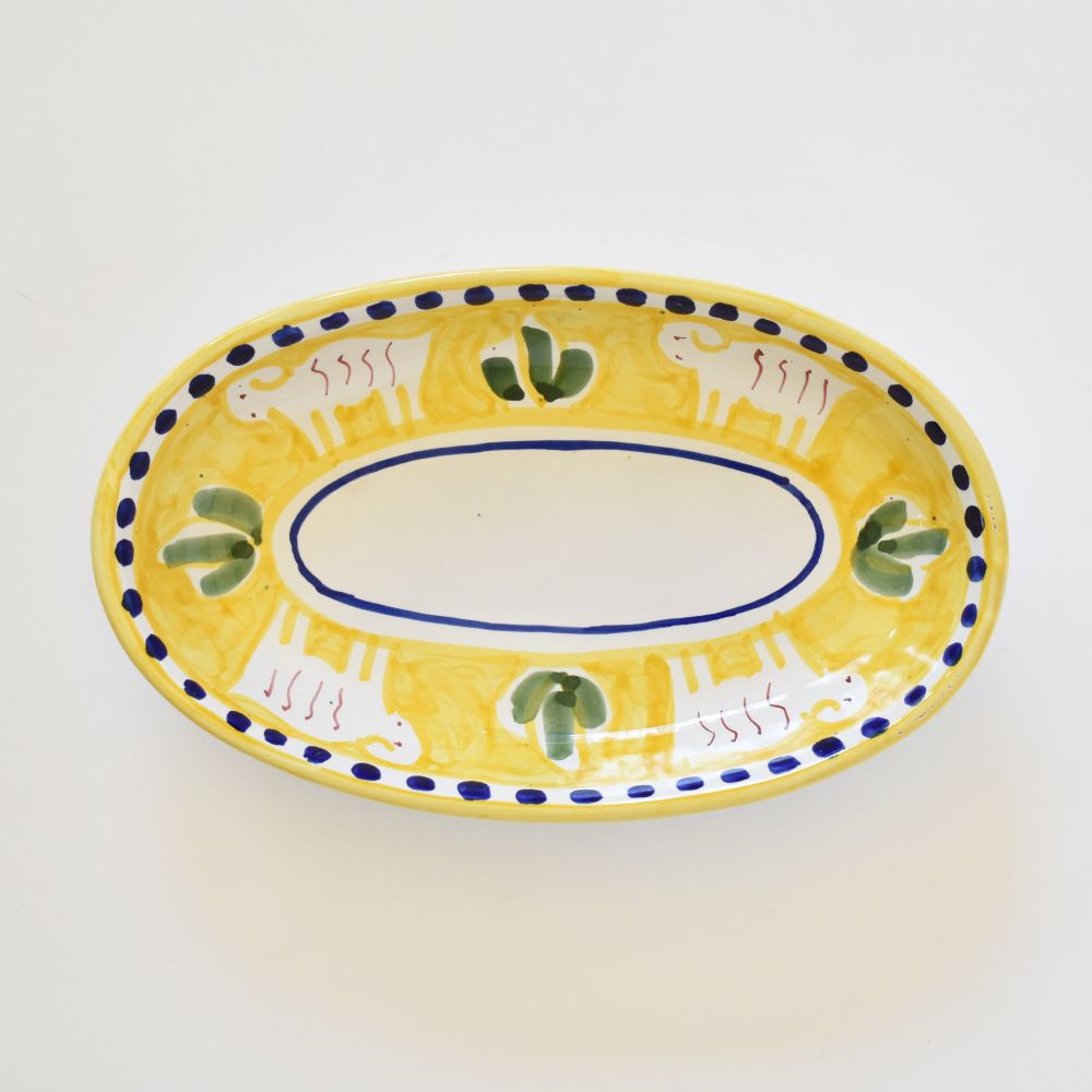 Ci sono due gruppi di persone: chi sa di non poter vivere senza questo piatto da portata di medie dimensioni in un brillante giallo Montone (Ram), e chi sta per unirsi al primo gruppo. È perfetto per verdure e contorni, o qualsiasi altra ricetta che di solito viene messa in ombra da una ciotola da portata di dimensioni standard. La collezione di ceramiche da tavola Campagna dello studio Solimene è realizzata a mano a Vietri sul Mare, sulla Costiera Amalfitana.