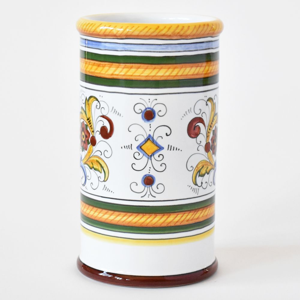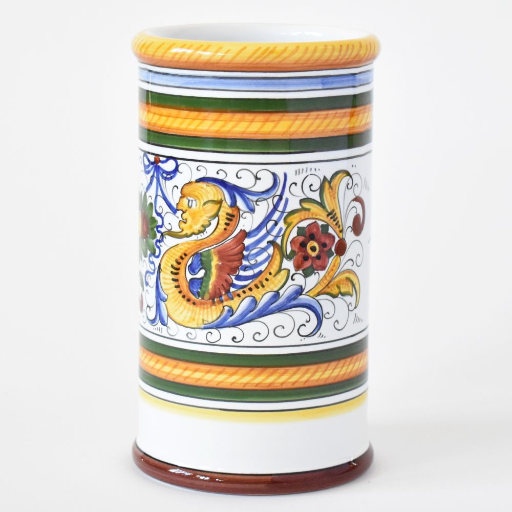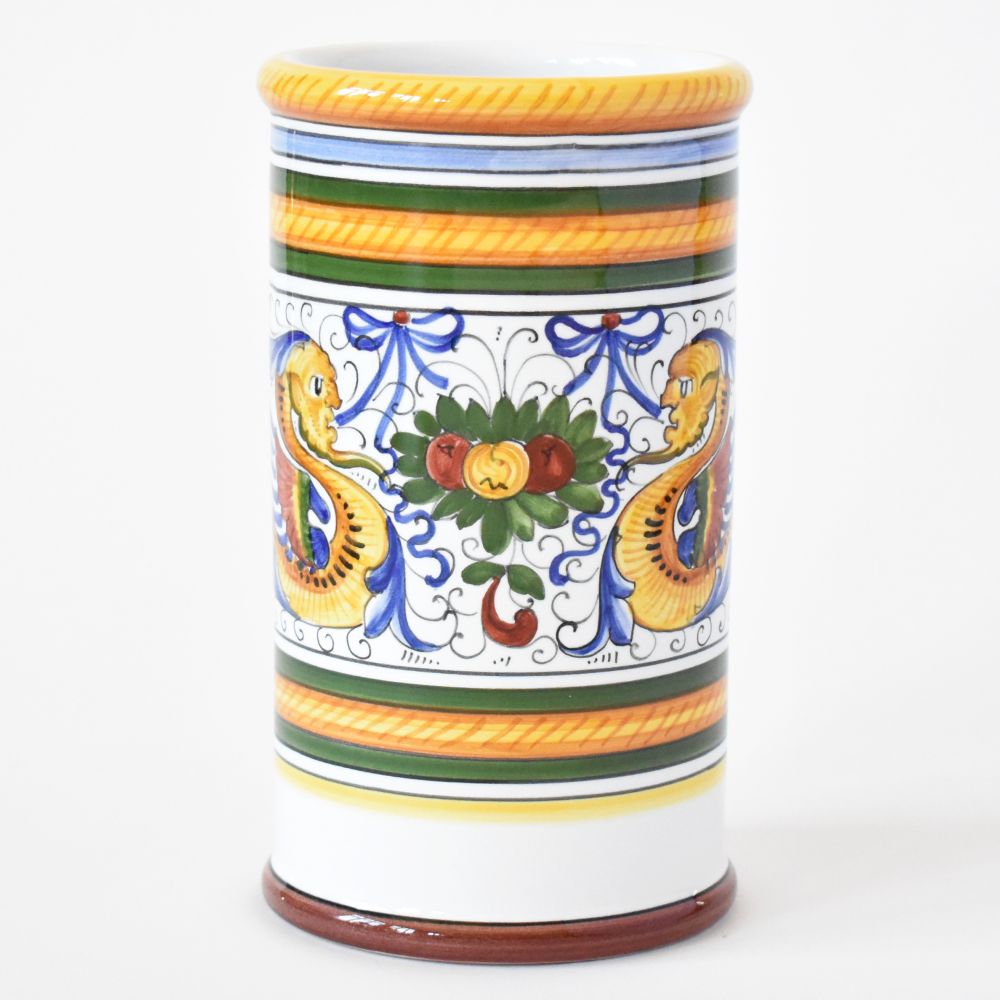 Mantenete una bottiglia fresca e rinfrescante in questo portabottiglie in ceramica dipinto a mano con il tradizionale motivo Raffaellesco a draghi stilizzati di Deruta, Italia . Quando questo portabottiglie non è in uso, adoriamo riempirlo con fiori recisi o utensili da cucina alti.