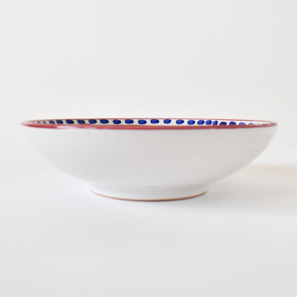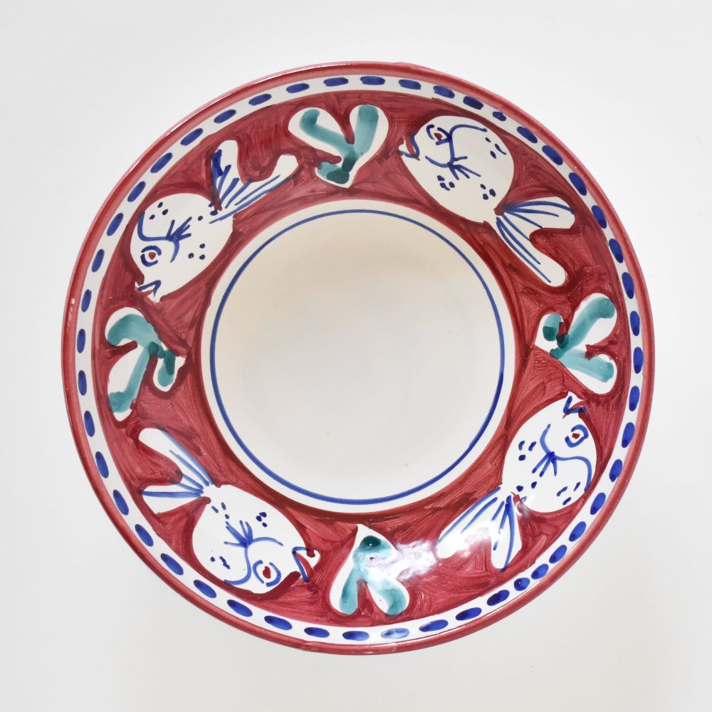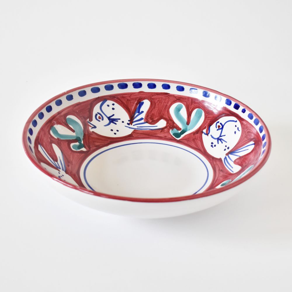 Il Pesce Rosso della collezione Campagna nuota intorno alla nostra ciotola preferita in assoluto per generose porzioni di pasta. La forma a coppa di questa ciotola in ceramica è perfetta anche per insalate singole condite con proteine, o come piatto da portata per servire salse o portare in tavola contorni di cereali o verdure. Dipinto a mano dallo studio Solimene di Vietri sul Mare, sulla Costiera Amalfitana.